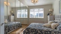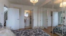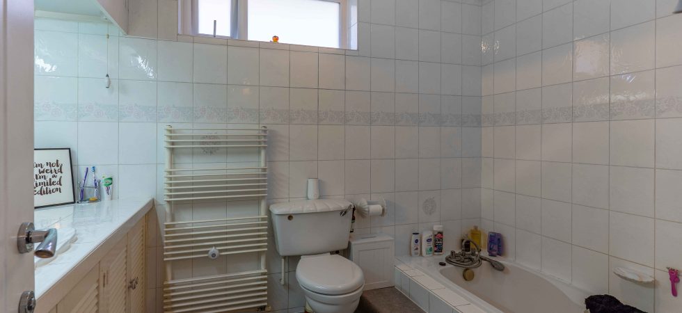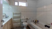 Side elevation windows, ladder radiator, vanity wash basin with cupboards below and overhead storage cupboards. Tiled walls, semi sucken bath with mixer tap and hand shower attachment, w/c.