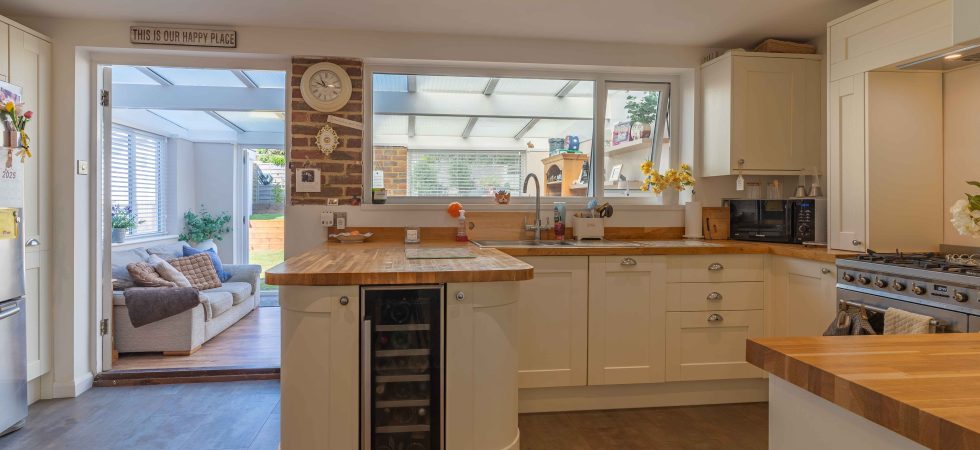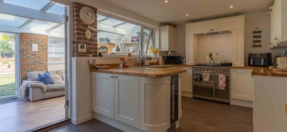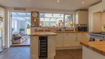 Duel aspect double glazed windows overlooking rear garden and double patio doors accessing same. Work surfaces with cupboard below housing washing machine and tumble dryer.