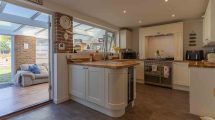 Comprising a range of wall and base units, breakfast bar, 1½ bowl sink unit with mixer tap with instant boiling water, space for freestanding fridge/freezer, radiator, Smeg cooker with gas hob and extractor above, vinyl flooring. Recessed ceiling spot lights, integrated dishwasher and wine fridge. Double, glazed doors opening into: