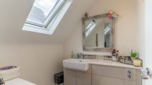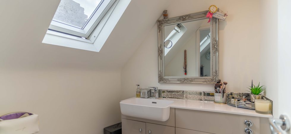 Velux window to side elevation, vanity wash basin with mixer tap and cupboards below, wc.