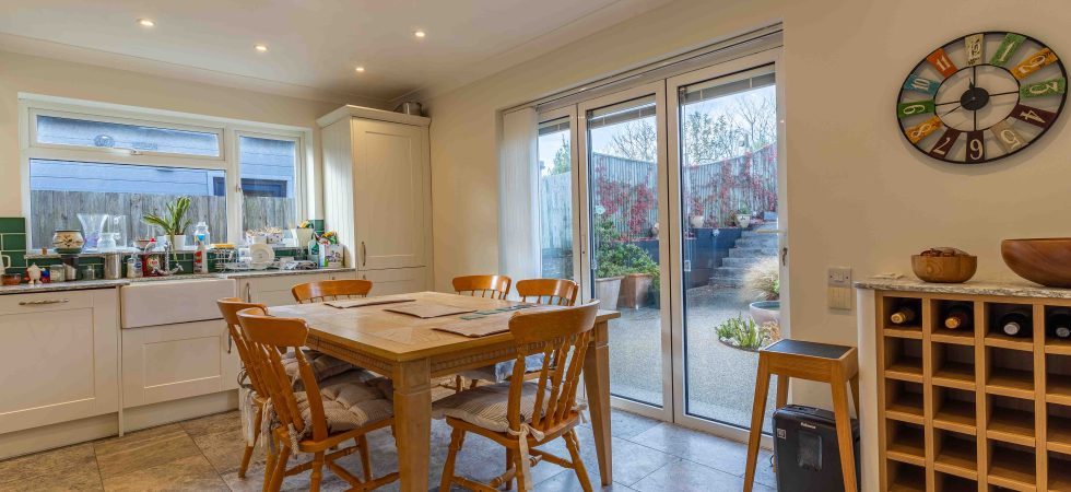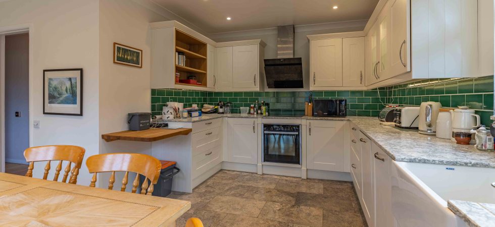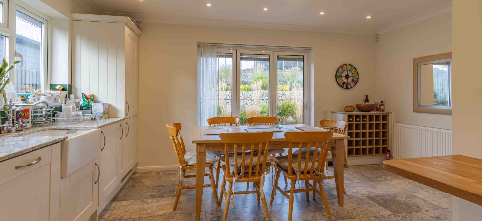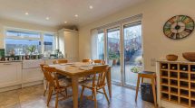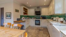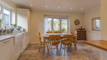 Comprising a range of wall and base units, side elevation double glazed window, feature bi-folding doors overlooking and accessing rear garden. Recessed ceiling spotlights and under counter lighting, tiled flooring, sink unit with mixer tap. Intergrated fridge/freezer, dishwasher, washing machine. Neff oven with hob and extractor above.