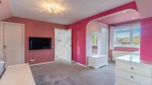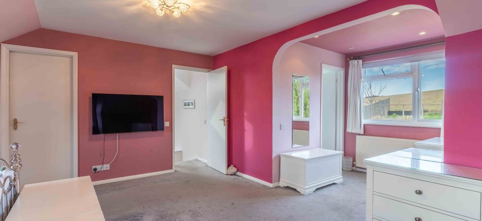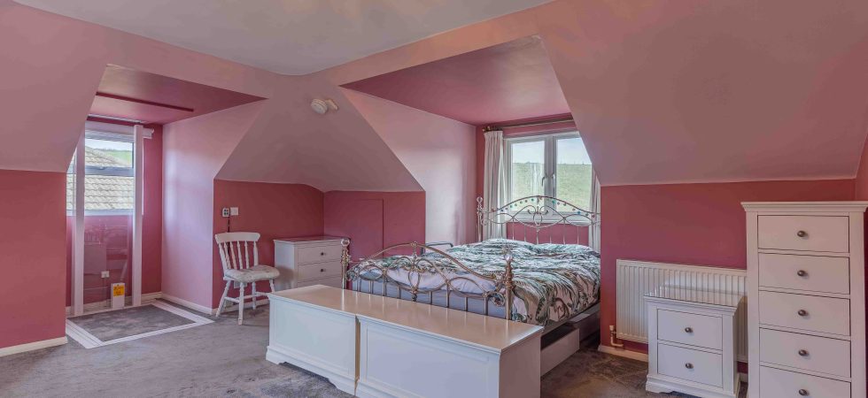 A triple aspect room with double glazed looking to front, side and rear elevations. Large walk in storage room/wardrobe. Two radiators and two eaves storage cupboards. Door to:
