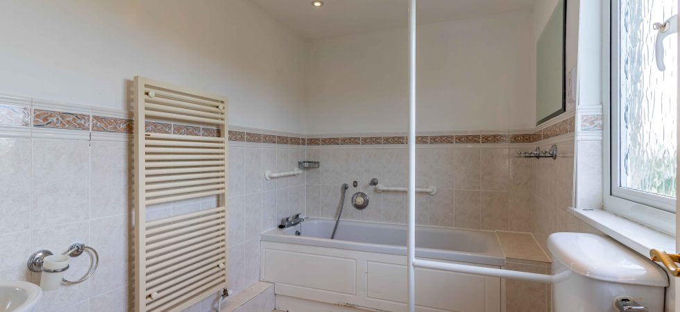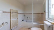 Obscure double glazed window, recessed ceiling spotlights, tiled flooring and part tiled walls. Laddder radiator. Bath with mixer tap and independat shower attachment, wash basin with mixer tap and w/c.