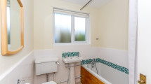 Double glazed obscure glass side elevation window, part tiled walls, panelled bath with mixer tap and hand shower attachment, shower curtain and rail, pedestal wash basin, low flush w.c, chromium heated towel rail.