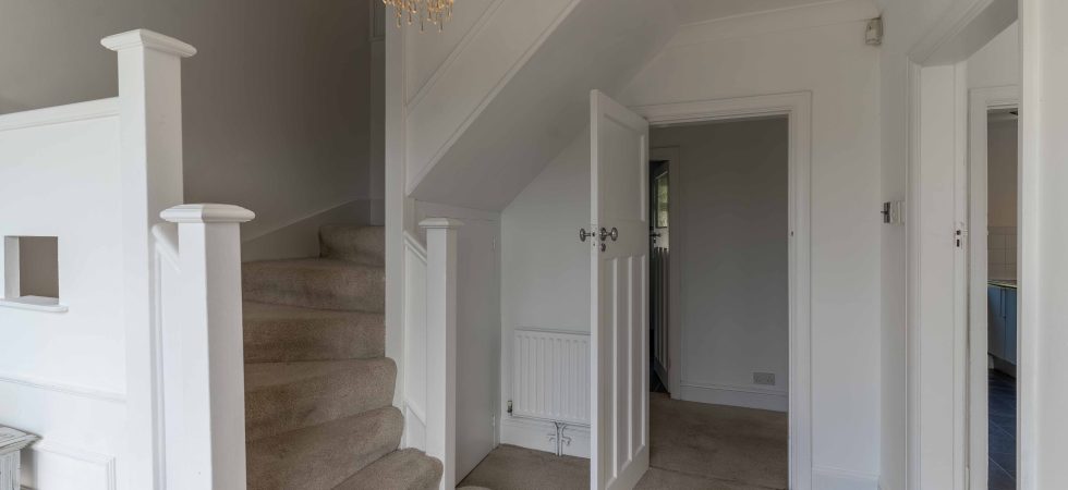 Radiator, heating thermostat, understairs cupboard. Door to:
