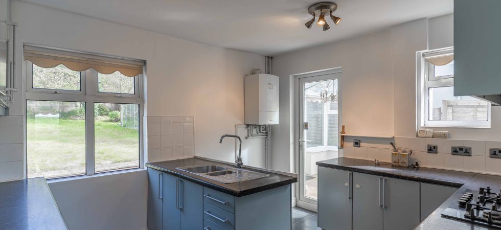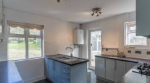 Double aspect room with main view over the rear garden. Comprising a range of wall and base units, , 1½ bowl sink unit with mixer tap, space for freestanding fridge/freezer, washing machine, dishwasher. Oven with gas hob and extractor above. Wall mounted gas fired boiler for heating and domestic hot water. Double glazed door opening into: