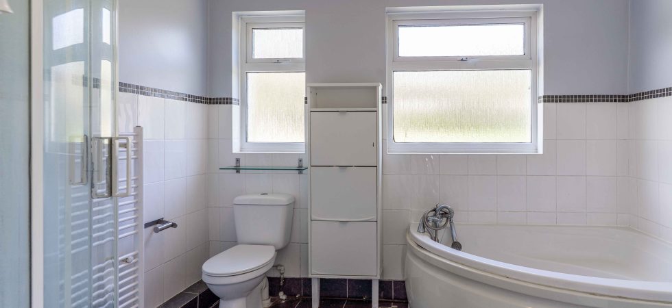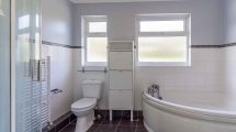 Obscure double glazed windows, tiled flooring and part tiled walls, radiator and additonal ladder radiator, corner panelled bath with mixer tap and hand shower attachment, vanity wash basin with cupboards below. Shower cubicle and w/c.