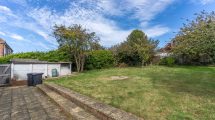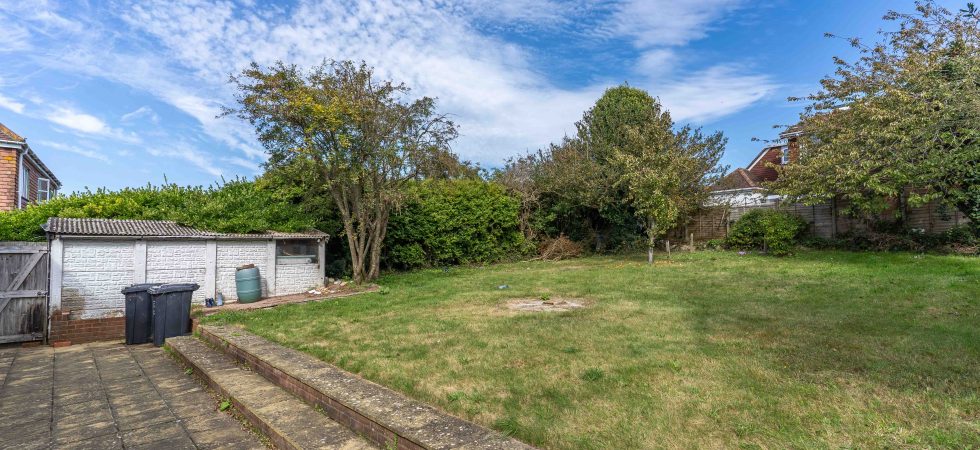 Of notable size, laid to lawn, with full width paved patio area. Well established trees, hedge and fenced boundaries.