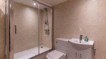 Pergo floor covering, generous shower cubicle, vanity style wash basin with close coupled WC suit, tiled walls, recessed ceiling spotlights, extractor fan.