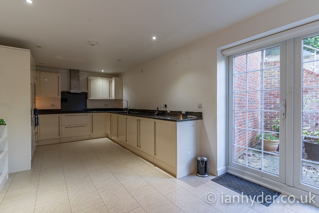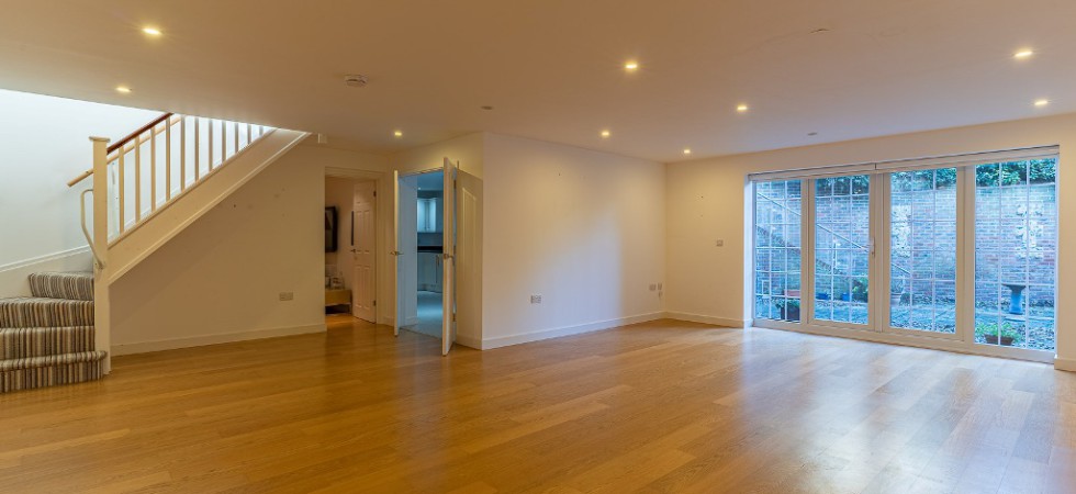 Windsor oak strip flooring double opening doors onto rear terrace/garden area, recessed ceiling spotlights, wall thermostat
