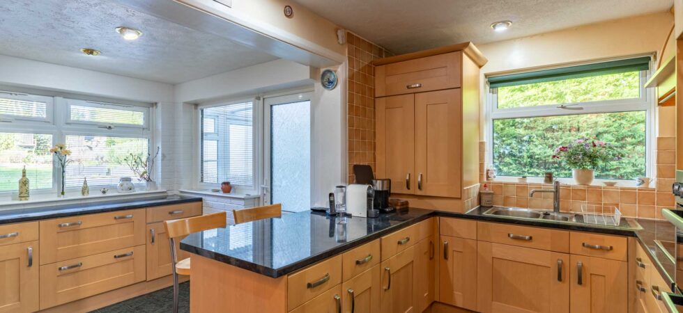 Double glazed side elevation window, comprising 1½ bowl single drainer sink unit with mixer tap set in laminate work surface with integrated dishwasher, washing machine, fitted double oven, with space for microwave above. Various eye level wall storage cupboards, cupboard housing Worcester gas fired boiler for heating and domestic hot water. Further laminate work surface with double glazed windows overlooking rear garden, drawers, cupboards, integrated fridge, radiator and tiled flooring.