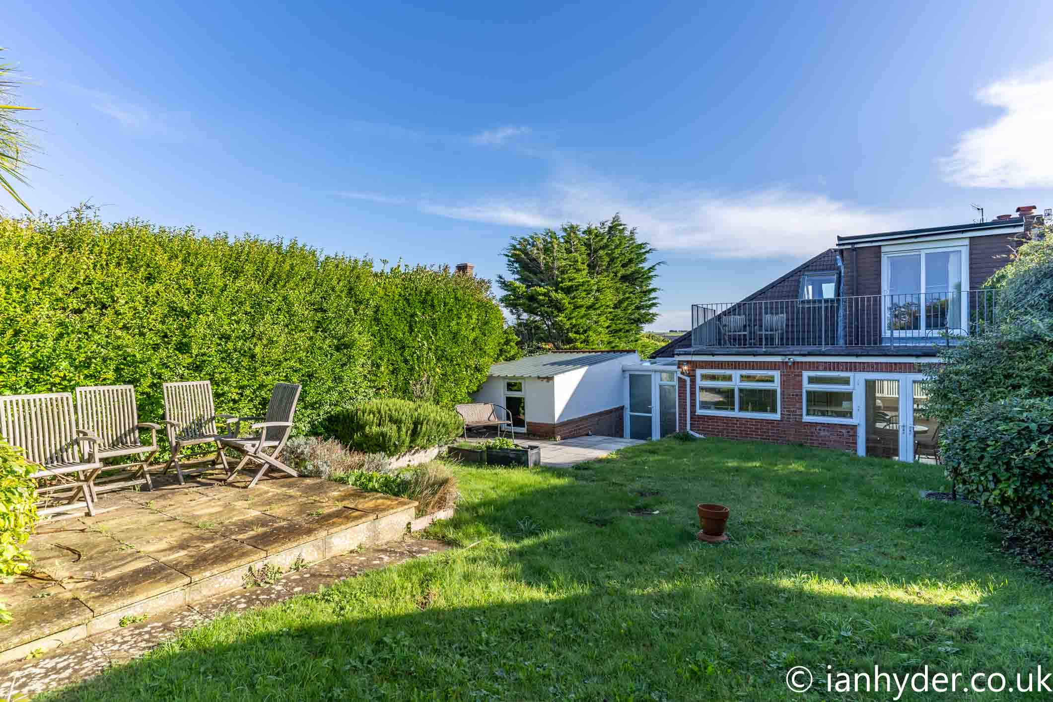 Paved steps to paved patio area, laid to lawn with abundance of established trees and hedged boundaries.